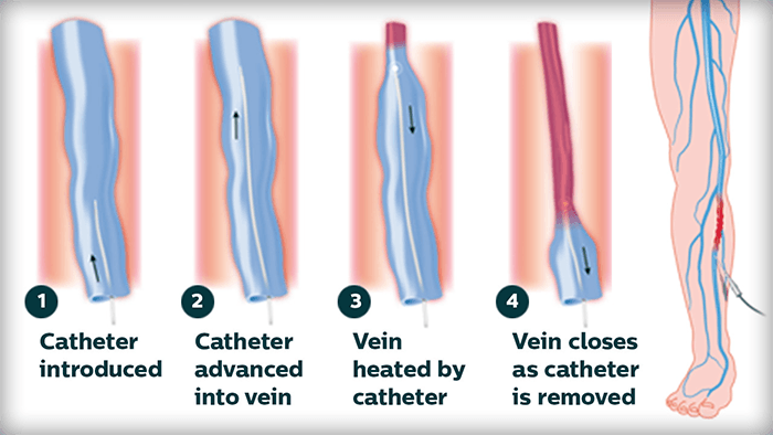 A minimally invasive treatment that uses lasers, radiofrequency, non-thermal ablation or mechanochemical ablation to shut down large varicose veins in the legs.